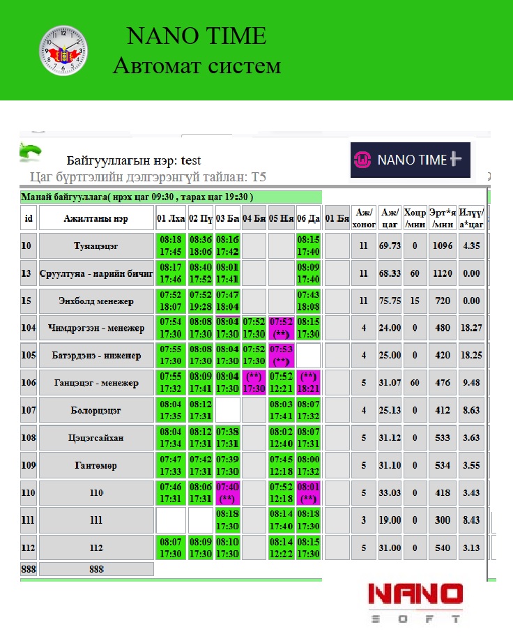 *   Өнгөт програм видео:   Нано тайм цаг бүртгэл v24a